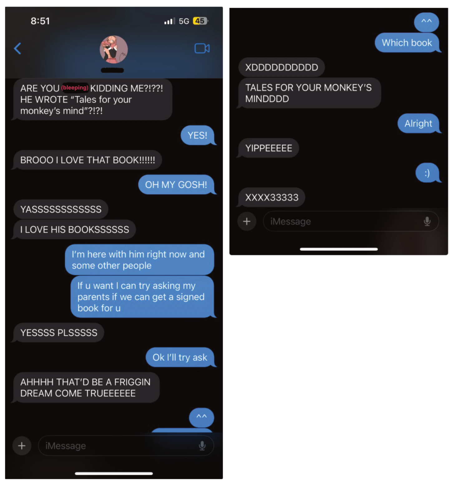 While I was dancing, one of my friends came up to me and said, “I have to show you this,” and he held out his daughter’s phone. His daughter, about thirteen years old, had been texting one of her friends, explaining that she was at my book launch with her parents. At first I wasn’t sure what I was looking at, and then my friend pointed out that his daughter’s friend not only knew who I was, but also loved my book series—and my “cool factor” had risen in his daughter’s mind by several points. (BLUE is my friend’s daughter and BLACK is her friend).